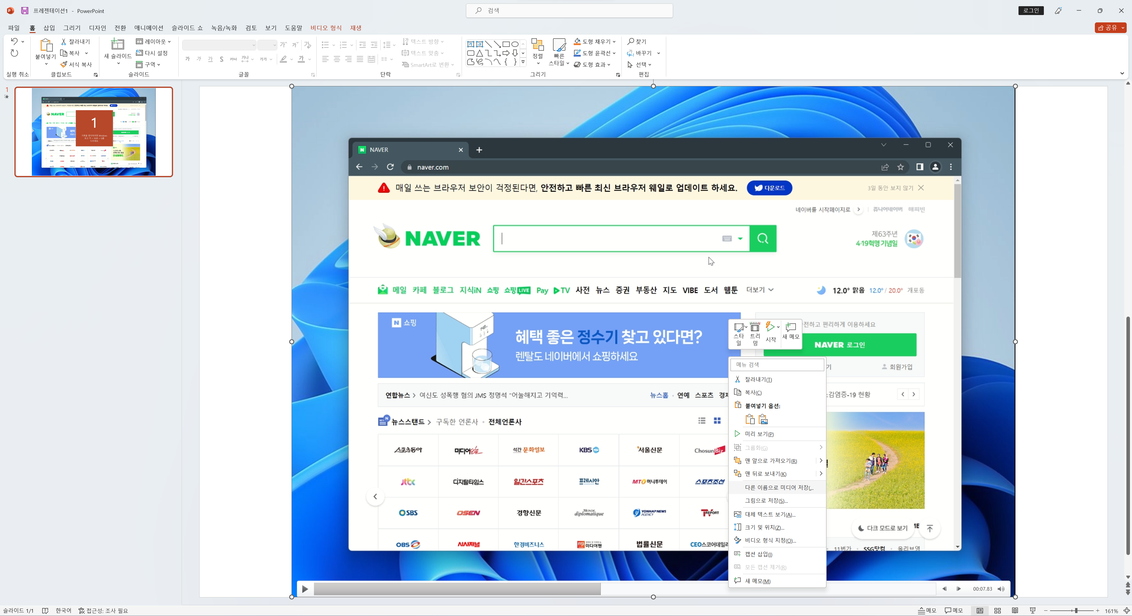그리고 프레젠테이션 화면의