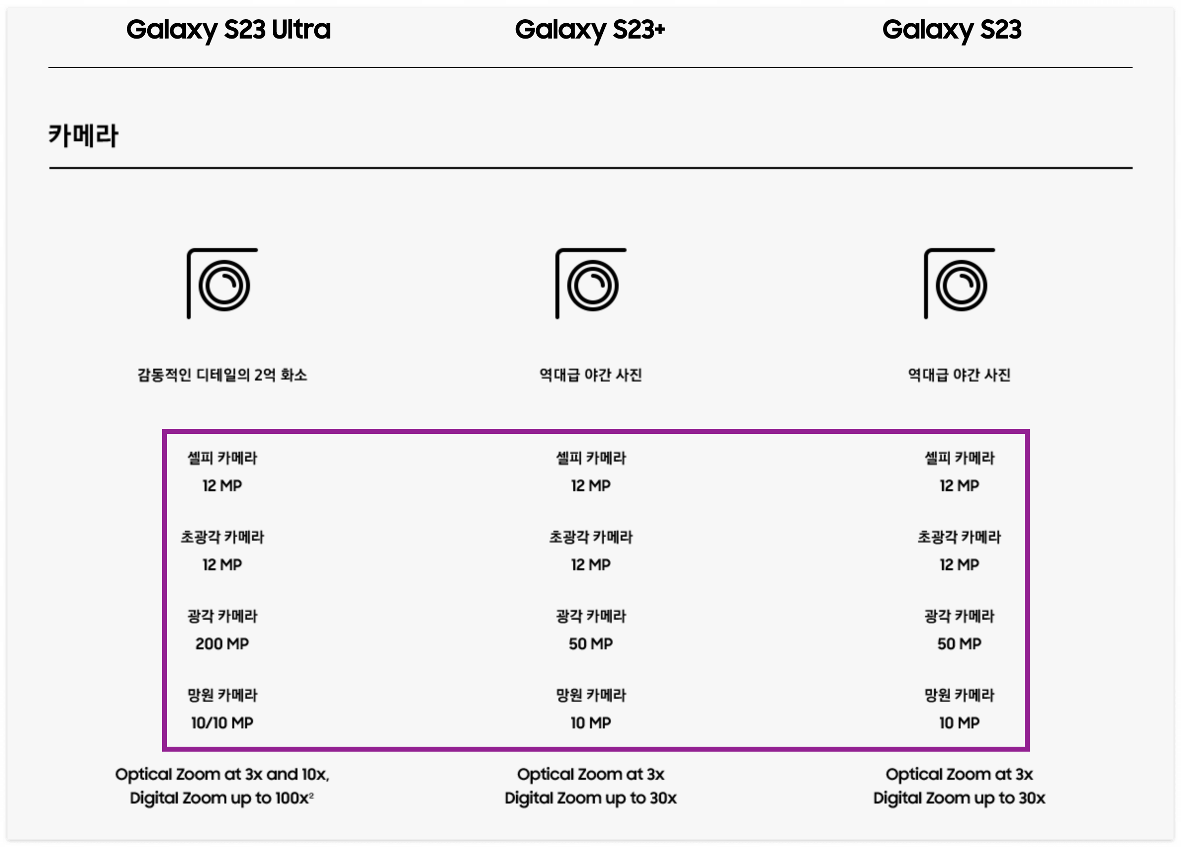 갤럭시 S23 울트라의 제원 정보를 보면 광각 카메라의 200MP 정보를 볼 수 있습니다.